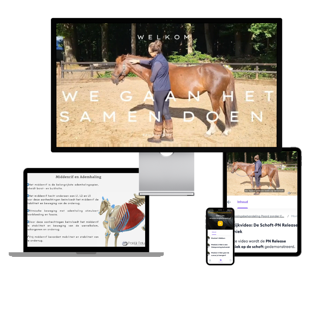 In de praktijkmodules leer je stap voor stap de PN Release-technieken toepassen, de ontspanningssignalen van je paard herkennen en hier effectief op reageren – je ziet en merkt direct het resultaat.
